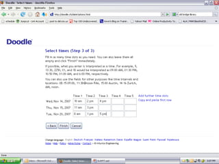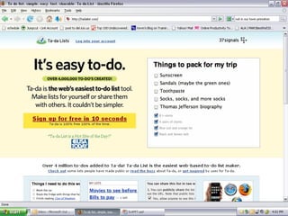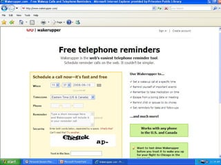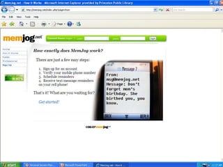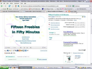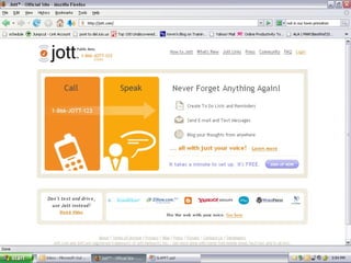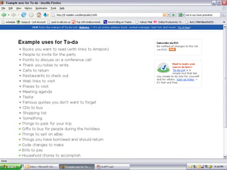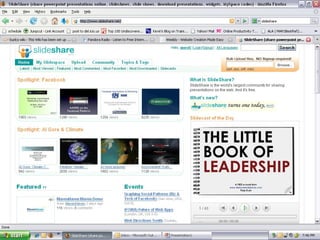 The document discusses various Web 2.0 tools that can help save time and connect people more easily. It provides descriptions and links to tools like Library Thing for cataloging books, Memjog for setting reminders by text message, Wakerupper for scheduling phone call reminders, Zamzar for converting file formats, and Slideshare for sharing PowerPoint presentations. The document encourages exploring this growing area and provides tips on finding new free Web 2.0 tools through sites like PC Magazine and SEOmoz.