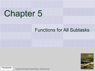 The document discusses functions in C++. It covers void functions which return no value, call-by-reference parameters which allow a function to modify the argument passed to it, and using preconditions and postconditions to document functions. It provides examples of defining and using void functions, call-by-reference parameters, and specifying preconditions and postconditions for functions. It also gives an example problem of calculating retail price based on wholesale price and days until item sells, which is broken down into subtasks that could each be implemented as a function.