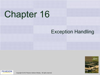 The document discusses exception handling in C++. It covers the basics of try blocks, catch blocks, and throwing exceptions. The key components of exception handling are try blocks, which enclose code that may throw exceptions; throw statements, which transfer control to a catch block; and catch blocks, which handle exceptions. Exception classes can be defined to identify different types of exceptions. Functions should specify which exceptions they may throw to inform callers. Exceptions should generally be used for unexpected errors rather than regular control flow.