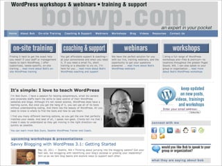 The document outlines strategies for effectively using a blog to market a business rather than just trying to make money from the blog itself. It compares WordPress.com and self-hosted WordPress, discussing setup, themes, widgets, and plugins, highlighting that self-hosted offers greater flexibility. It also emphasizes the importance of content, understanding reader behavior, and various methods for promoting and monetizing a blog.