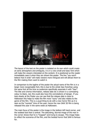 The poster uses isolated text in a small font to intrigue viewers and draw them in. It positions the text so it is immediately visible. The line "you won't believe how it ends" further intrigues viewers and makes them want to watch the film. The title uses a recognizable large font associated with the Saw franchise. Release date information is in a contrasting red color that conveys danger. The date is close to Halloween, relating it to the scary time of year and horror genre. The main focus is a blurred, trapped image in the corner reflecting the film's twisted scenarios and Saw's fame for horror.