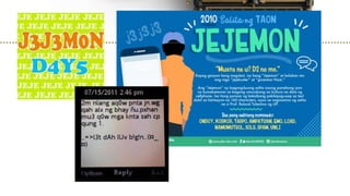 Ang dokumento ay naglalarawan ng iba't ibang salitang hiram at modernong terminolohiya sa Filipino, kasama ang kanilang kahulugan at konteksto. Kabilang dito ang mga salitang gaya ng 'unli', 'spam', 'solb', at 'emo', na may mga tiyak na kaugnayan sa teknolohiya at kultura. Ilan sa mga salitang ito ay naging tanyag dahil sa kasalukuyang uso o pangyayari, gaya ng 'jejemon' na itinanghal na 'salita ng taon' noong 2010.