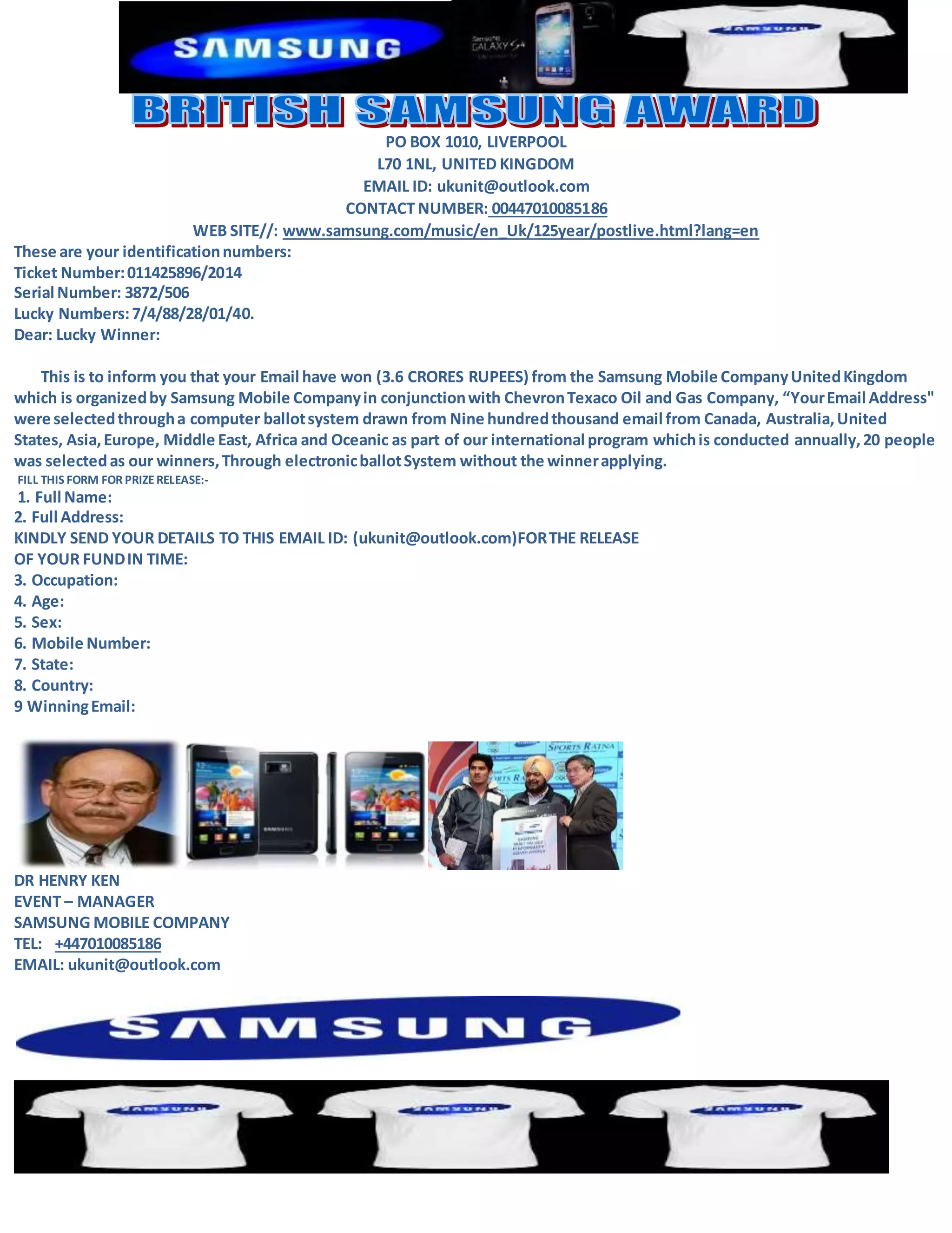 This document appears to be a scam email claiming the recipient has won a large prize from Samsung Mobile Company. It provides identifying numbers for a ticket and serial number, as well as lucky numbers. It claims the recipient's email was randomly selected through a computer ballot system to win 3.6 crores rupees. It requests the recipient fill out a form with personal details like name, address, occupation, age, sex, mobile number, state and country to claim the prize. The contact information provided is for a Dr. Henry Ken at Samsung Mobile Company.