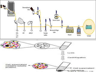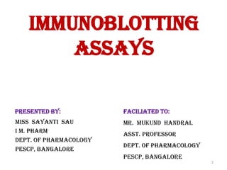 Immunoblotting assays such as Western blotting allow detection of specific proteins in complex mixtures by separating proteins by gel electrophoresis, transferring them to a membrane, and using antibodies to identify target proteins on the membrane. The presentation provides details on the key steps of tissue preparation, gel electrophoresis, protein transfer, blocking, detection using labeled antibodies, analysis, and applications of immunoblotting assays like Western blotting.