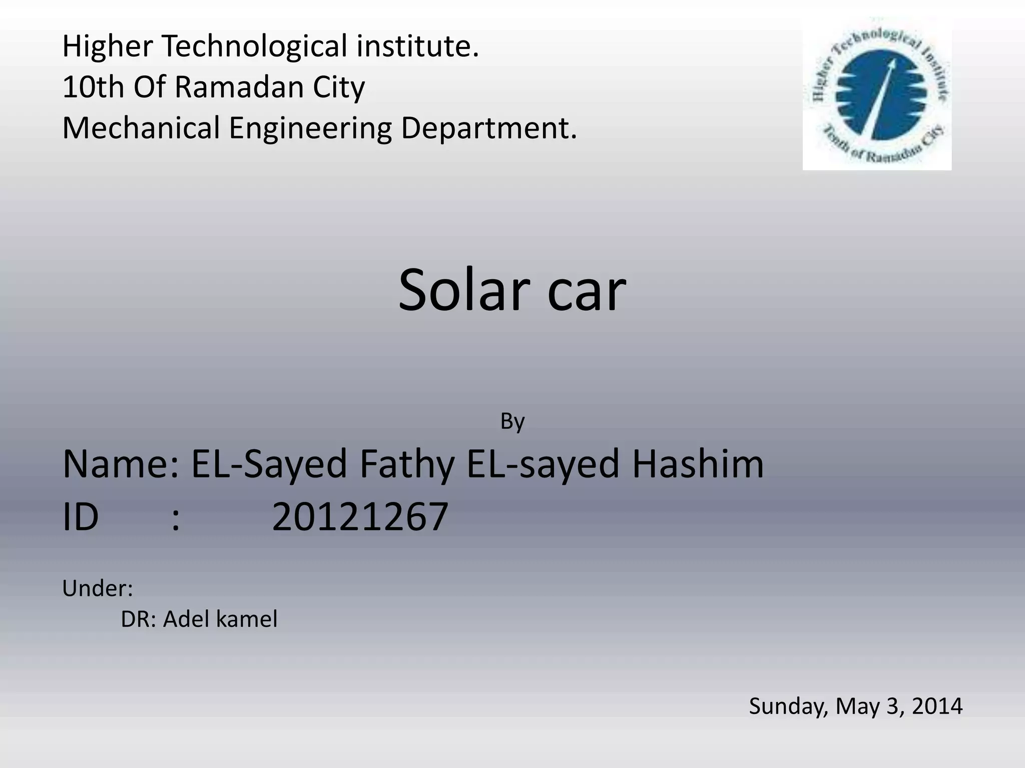 The document discusses the design and components of a solar vehicle, highlighting the importance of renewable energy as a sustainable power source. Key elements include solar cells, power trackers, electric motors, and batteries, all crucial for converting sunlight into electrical energy for propulsion. The overall objective is to create efficient solar cars for racing and utility purposes, while addressing the challenges of weight, strength, and safety in their construction.