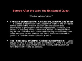 The document provides information on European and American art movements after World War 2, including Existentialism, Abstract Expressionism, Pop Art, Minimalism, and the Beat generation. It includes brief descriptions of influential artists like Pollock, de Kooning, Warhol, Stella, and Ginsberg, as well as examples of their key works. Images and discussion questions are also included to illustrate the concepts.