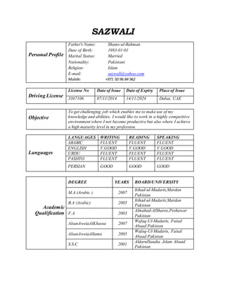 SazWali is a Pakistani national born in 1983 who is currently residing in Dubai, UAE. He holds a B.A. and M.A. in Arabic from Itihad-ul-Madaris in Pakistan. SazWali has over 15 years of experience teaching Arabic and Islamic studies in Saudi Arabia and currently works as a Sales Supervisor for Al Wasmi Pure Water Company in Dubai. He is proficient in Arabic, English, Urdu, Pashto and Persian.