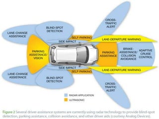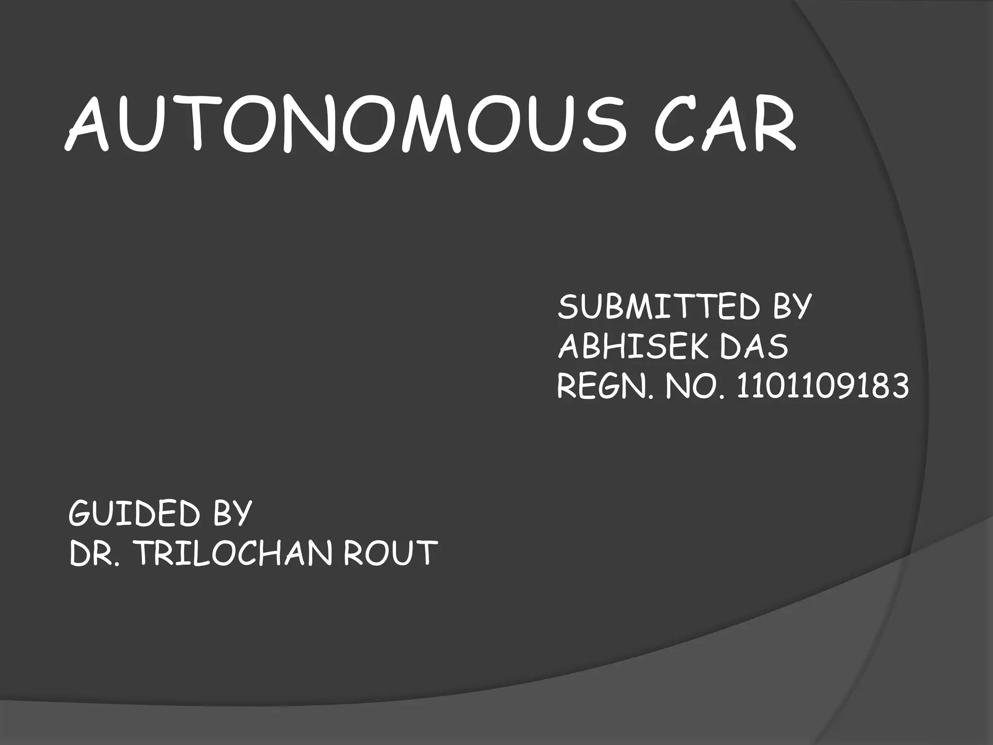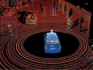 The document discusses autonomous or self-driving cars. It describes how autonomous cars use sensors like LIDAR, radar, cameras and ultrasonic sensors along with GPS and an inertial measurement unit to navigate without human intervention. The central computer combines data from these sensors to construct a 3D map of the vehicle's surroundings and control systems like steering and braking. Major companies developing autonomous vehicle technology include Google, Audi, BMW, Ford and General Motors.