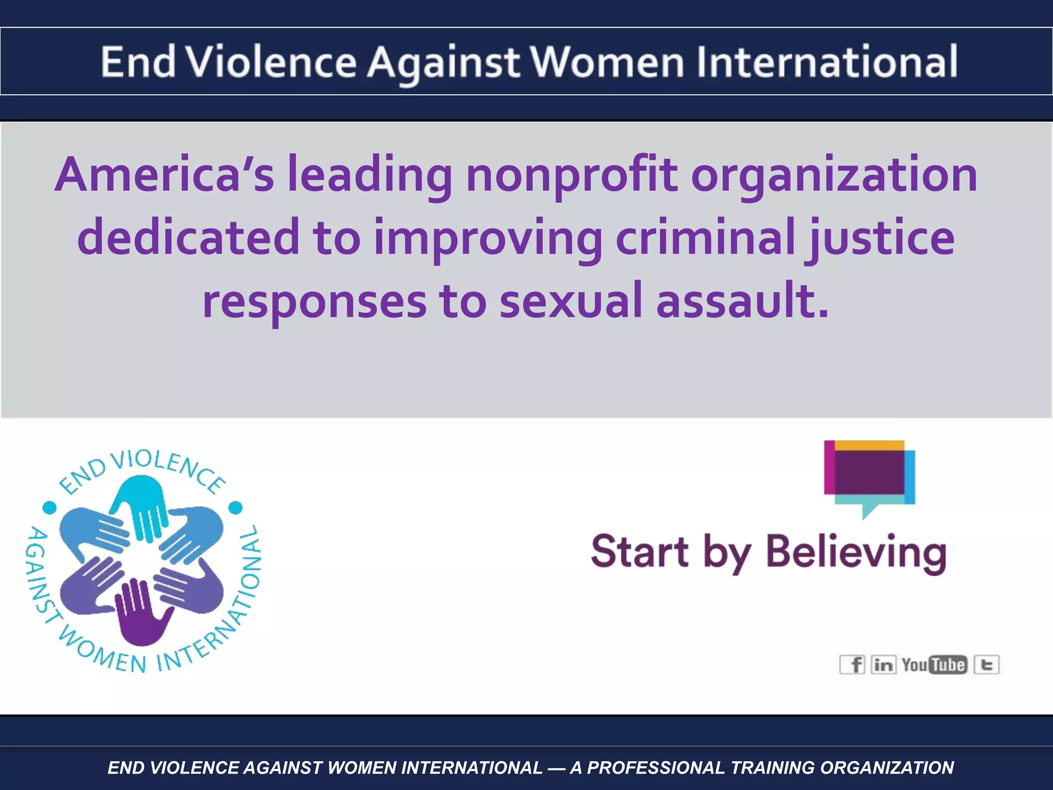 This document describes End Violence Against Women International (EVAWI), which created the "Start by Believing" public awareness campaign. The campaign aims to educate the public and professionals on providing supportive responses to disclosures of sexual assault. Research shows negative social reactions can retraumatize victims, while positive support from friends and professionals benefits recovery. The campaign provides materials to launch local initiatives and increase reporting. Preliminary evidence suggests it may be increasing reports and demand for victim services. The goal is to better prepare communities to support victims from initial disclosure.