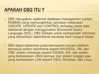 DB2 adalah sistem manajemen basis data relasional yang memungkinkan pengguna melakukan pembuatan, pembaruan, dan pengendalian basis data relasional menggunakan SQL. DB2 dapat berjalan pada berbagai platform dan menyediakan akses basis data dari berbagai aplikasi client melalui jaringan. DB2 mengelola objek-objek seperti database, tabel, indeks, dan grup penyimpanan untuk menyimpan dan mengakses data.