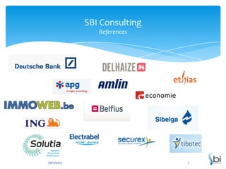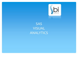 The document discusses SBI Consulting, a SAS Business Intelligence consulting firm that offers solutions such as forecasting, demand planning, and customer intelligence using SAS software. SBI Consulting provides high-quality consulting services for business intelligence including implementing SAS Visual Analytics solutions with features such as separate test and production environments, release management, and hosting SAS Visual Analytics on an internal server farm. The document provides an overview of SBI Consulting's offerings and an example of how they could implement and host a SAS Visual Analytics solution for a customer.