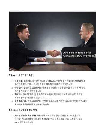 대기 신용장(SBLC)이 필요하지만 정품 공급업체를 선택하는 과정을 어떻게 탐색해야 할지 잘 모르겠습니까? 이 포괄적인 가이드에서는 신뢰할 수 있는 정품 SBLC 공급업체를 선택할 수 있도록 단계별 프로세스를 안내해 드립니다. SBLC를 처음 접하든 노련한 전문가이든 정품 공급업체를 찾기 전에 SBLC가 무엇이고 어떻게 기능하는지 이해하는 것이 중요하며, 이 가이드는 정품 금융 파트너 및 공급업체를 찾는 모든 사람에게 유익하고 도움이 되도록 고안되었습니다. 먼저 SBLC의 의미와 작동 방식을 간략하게 설명하겠습니다.