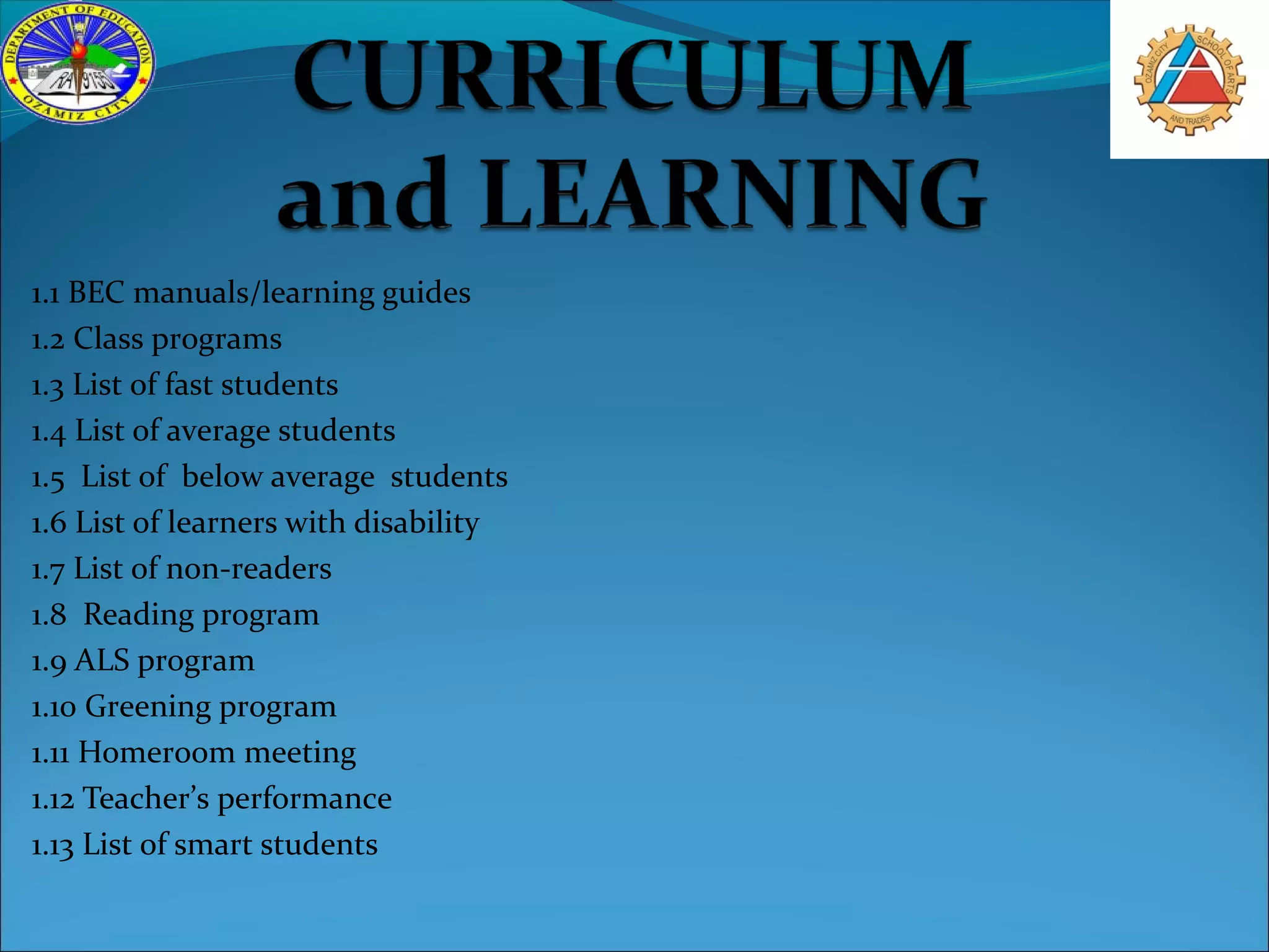 The document lists various reports, programs, tools, and records related to curriculum and learning at a school. It includes lists of students categorized by performance and ability, as well as reports on extracurricular programs. It also includes tools used for assessment, records of teacher training, and documentation of strategies used to support different types of learners.
