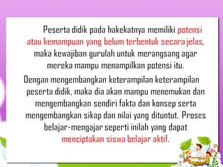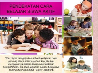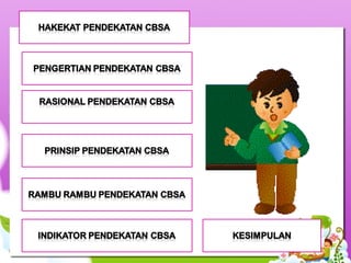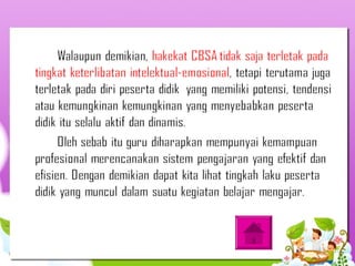 Dokumen ini membahas tentang pendekatan cara belajar siswa aktif (CBSA) yang menekankan pentingnya keterlibatan peserta didik baik secara fisik maupun mental dalam proses pembelajaran. Pendekatan ini bertujuan untuk mengoptimalkan keaktifan murid dan meningkatkan hasil belajar dengan menyesuaikan metode pengajaran dengan kebutuhan dan minat siswa. Selain itu, dibahas pula prinsip-prinsip dan indikator keberhasilan penerapan CBSA dalam konteks pendidikan.