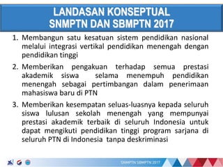 Dokumen ini menjelaskan sistem seleksi SNMPTN dan SBMPTN 2017 di Indonesia, yang bertujuan memberikan kesempatan pendidikan tinggi kepada siswa berprestasi dari berbagai wilayah tanpa diskriminasi. Penyelenggaraan dilakukan dengan prinsip transparansi, efisiensi, dan melibatkan sekolah menengah, serta mengacu pada berbagai regulasi pendidikan. Biaya seleksi sebagian ditanggung pemerintah, dengan rincian dan prosedur pendaftaran yang ditetapkan untuk peserta.