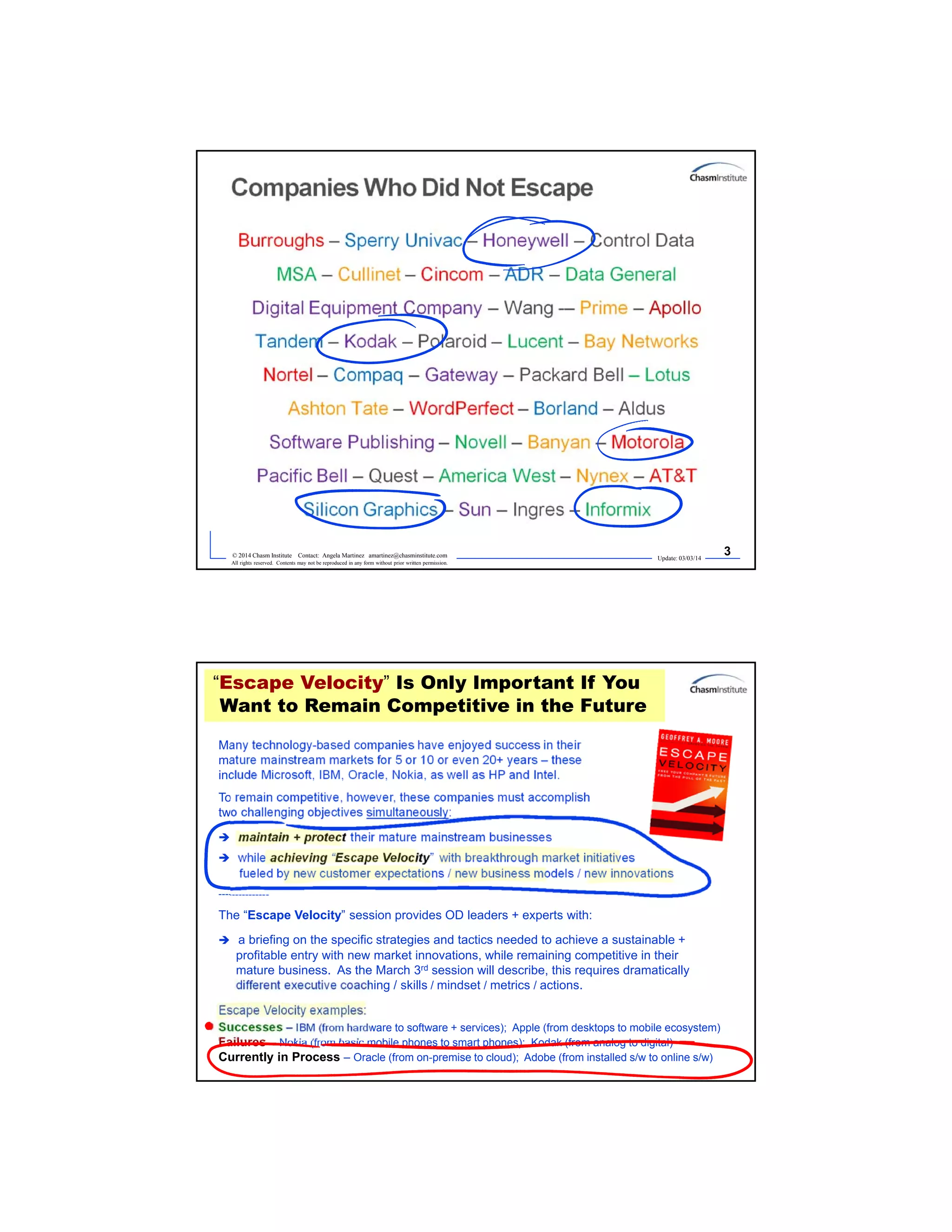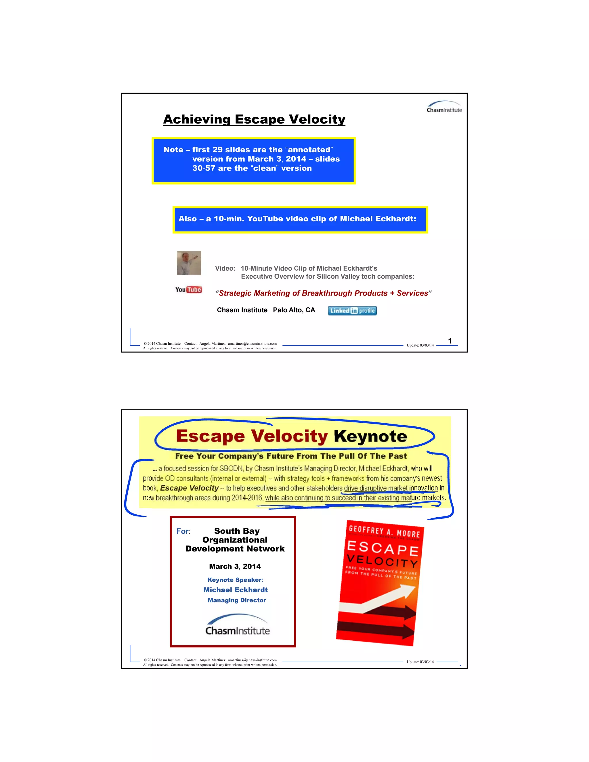 The document provides information about an upcoming keynote presentation by Michael Eckhardt of Chasm Institute on achieving "Escape Velocity." The presentation will provide organizational development consultants with strategies and frameworks from Chasm Institute's new book, Escape Velocity, to help executives drive disruptive innovation in new areas while continuing success in mature markets. Eckhardt will discuss the specific strategies and tactics needed to successfully enter new markets with innovations, which requires different skills and actions than leading in mature markets. The presentation will also analyze examples of companies that achieved or failed to achieve Escape Velocity.