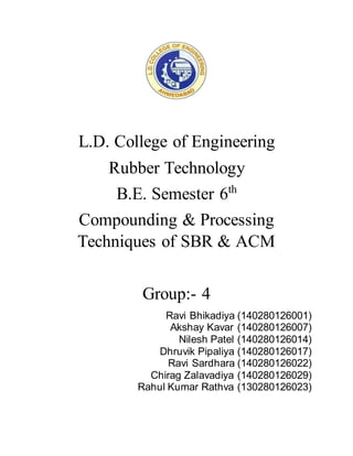 ACM is a synthetic rubber produced from acrylate monomers like ethyl acrylate, butyl acrylate, and methoxyethyl acrylate. It has good oil and temperature resistance properties. ACM is commonly used in automotive transmissions, hoses, seals, and mounts. It is produced via an emulsion polymerization process involving the addition of monomers and a chain transfer agent into a reactor over time.