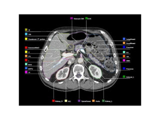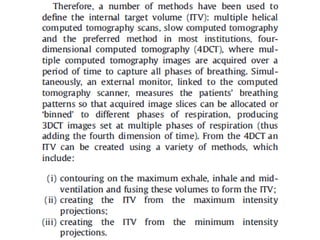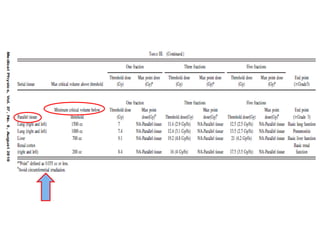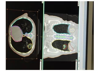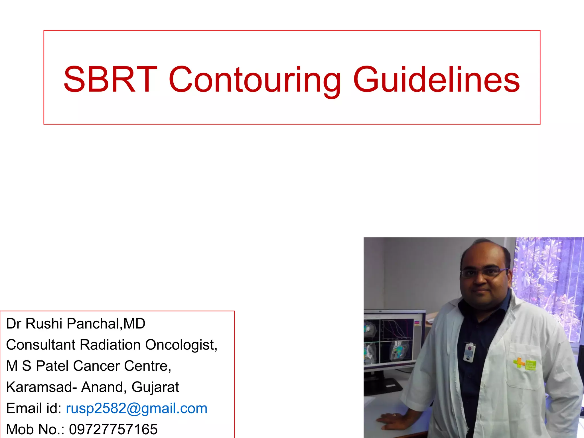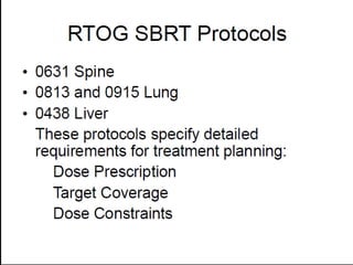 This document provides contouring and treatment planning guidelines for stereotactic body radiation therapy (SBRT). It discusses indications, contraindications, simulation, target volume delineation, organ at risk contouring, dose prescription, and plan evaluation for SBRT treatment of lung, spine, liver, and other cancers. Key considerations include ensuring accurate tumor targeting given organ motion, minimizing dose to nearby organs at risk, and prescribing ablative doses in a small number of fractions to achieve tumor control.