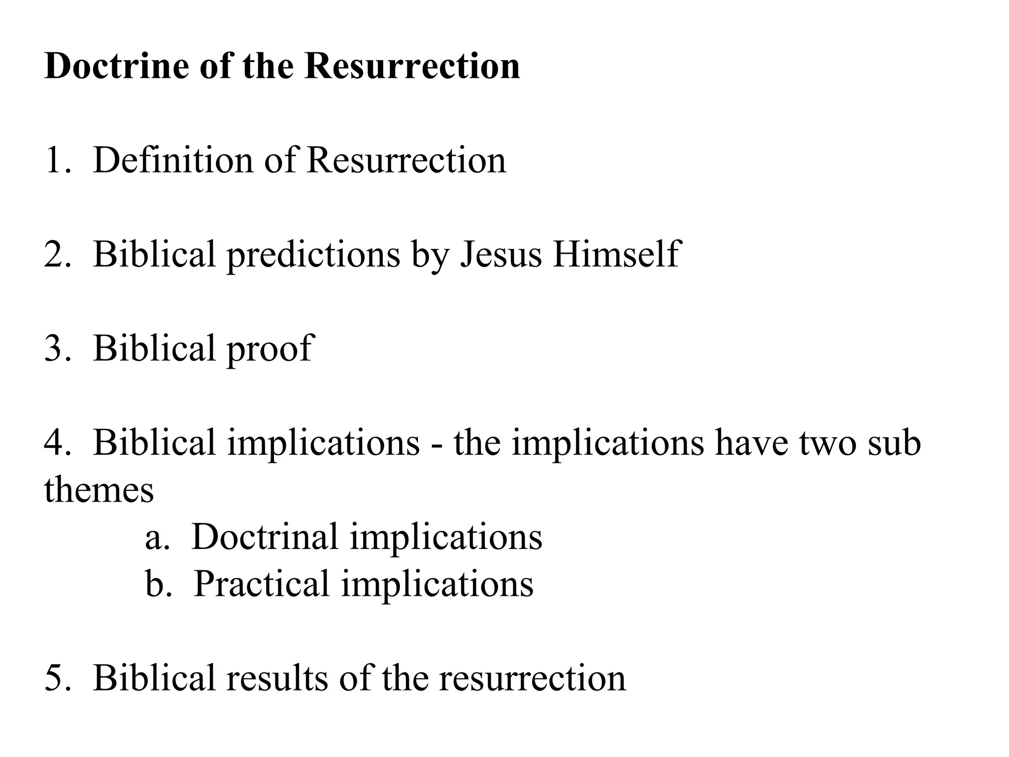 The document discusses the biblical doctrine of resurrection, beginning with a definition and expanding on predictions by Jesus, biblical proof, and implications. It explains that resurrection means the future bodily rising of all persons, with believers rising to eternal life and unbelievers to eternal torment. The resurrection of Christ ensures our justification, regeneration, and receipt of perfect resurrection bodies. It also has practical implications like continued obedience and focusing on our heavenly reward.