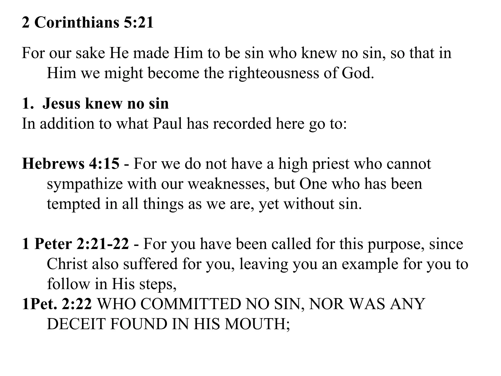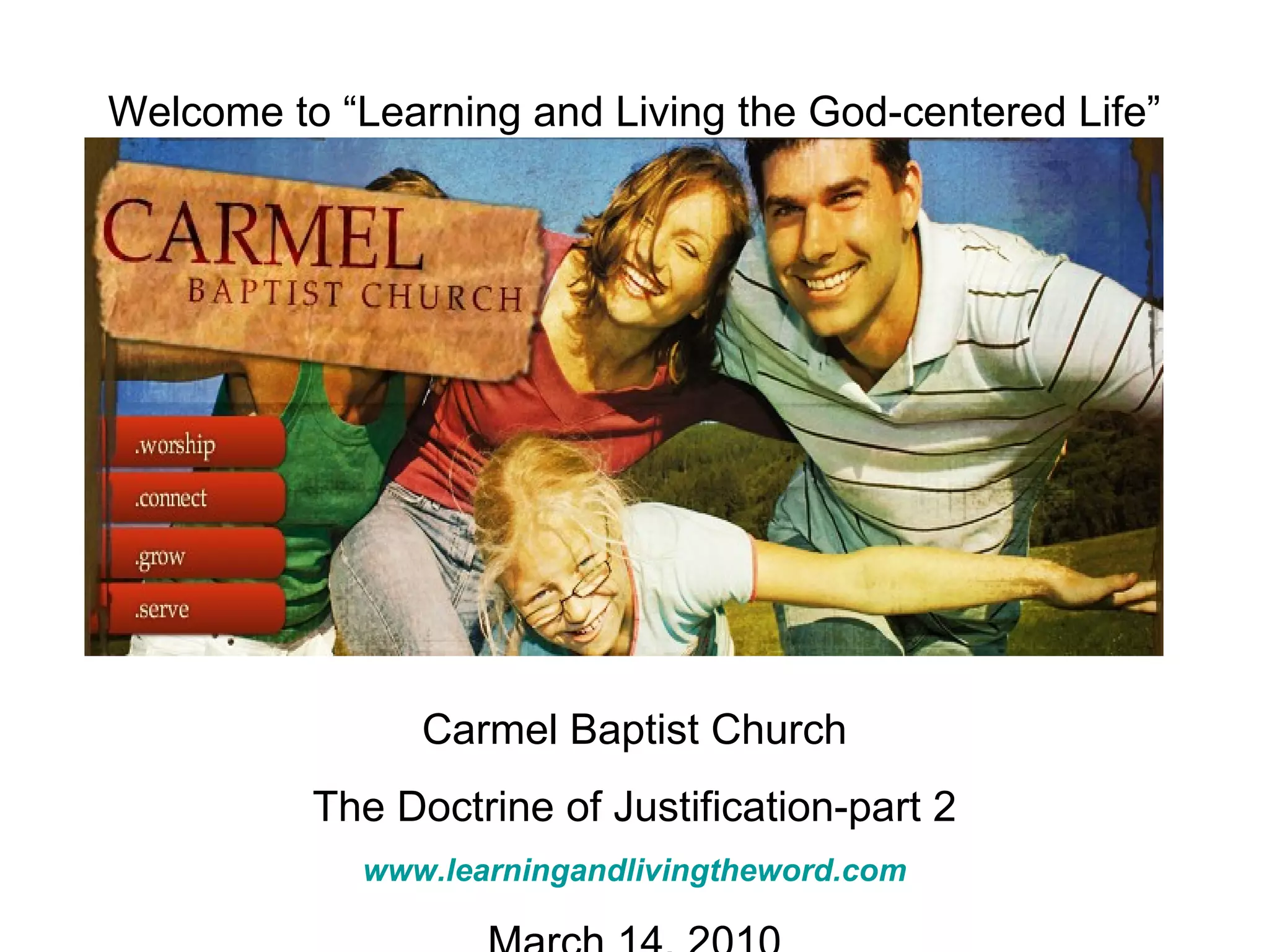 The document provides an in-depth discussion of the doctrine of justification according to Christianity. It discusses that Jesus knew no sin and committed no sin or deceit. It explains that for our sake, God made Jesus to be sin so that in him we might become the righteousness of God. It describes how God charges our sins to Jesus' account and his righteousness to our account, so that through faith in Christ we are seen as righteous in God's sight.