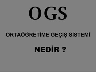 OGS İlköğretim 6,7ve 8inci sınıf öğrencilerinin yıllara yayılan seviye ve performans ölçümüyle alacakları puanlara göre ortaöğretim kurumlarına yerleştirilmelerini esas alan Seviye Belirleme Sınavı (SBS), Yılsonu Başarı Puanı (YBP), Davranış Puanı (DP) olmak üzere üç ana unsura dayanan öğrenci odaklı yeni bir sistemdir.