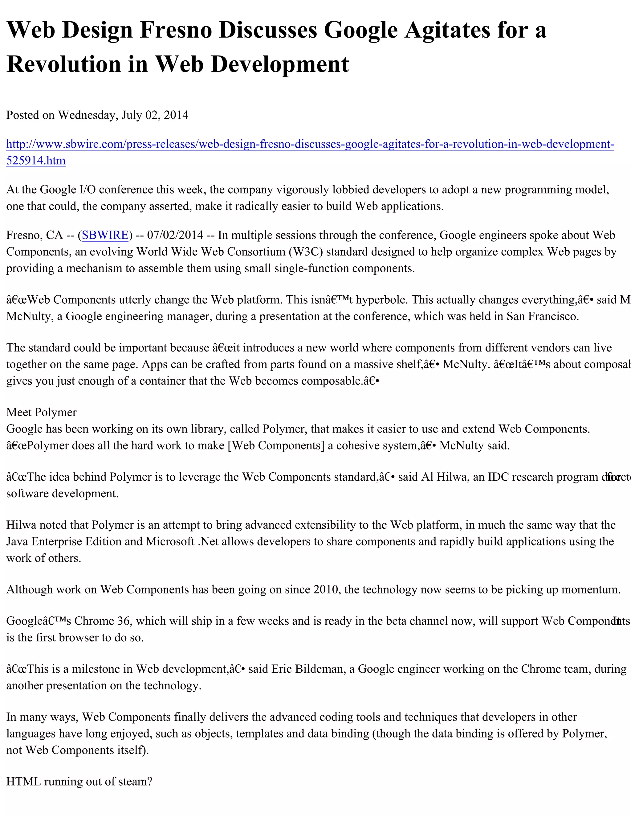 At the Google I/O conference, Google advocated for the adoption of Web Components, a W3C standard for building complex web pages out of small reusable components. Google's Polymer library makes it easier to use Web Components. Web Components allow for logical separation and compartmentalization of code, making development more productive. Support is growing from browser makers like Mozilla, Apple and Microsoft. Web Components could deliver advanced coding tools to web development like those enjoyed in other programming languages.