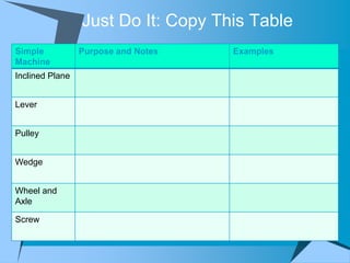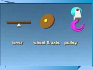 This document provides an overview of simple machines, including inclined planes, screws, levers, pulleys, wedges, and wheel and axle systems, explaining their functions and how they reduce the force needed to perform work. It includes definitions, examples, and activities related to each type of machine, along with illustrations and questions for comprehension. The document serves as a guide for learning about these machines and applying the concepts in practical scenarios.