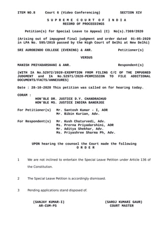 The Supreme Court of India heard a Special Leave Petition filed by Sri Aurobindo College (Evening) against a judgment of the High Court of Delhi. After hearing arguments from both sides, the Supreme Court dismissed the Special Leave Petition, stating that it was not inclined to entertain it under Article 136 of the Constitution. The pending applications in the case were also disposed of with the dismissal of the Special Leave Petition.