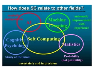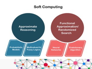 Soft computing is an approach that models cognitive behavior, allowing for solutions to complex problems that traditional hard computing cannot address due to imprecision and uncertainty. It employs methods like neural networks, fuzzy logic, and genetic algorithms to tackle real-world challenges efficiently. Applications of soft computing span various domains, including gaming, home appliances, robotics, and more, emphasizing its utility in managing ambiguous data and approximations.