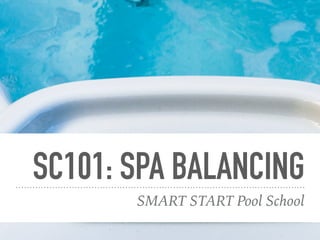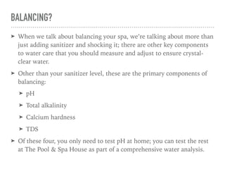 This document discusses the key components to balancing spa water: pH, total alkalinity, calcium hardness, and TDS. It states that pH is the most important to keep in range to allow other chemicals to work properly and reduce skin irritation. It provides information on testing each component and how to adjust levels if they are too low or high using various SpaGuard products. It recommends testing pH weekly and other components monthly with a water analysis to maintain clear, balanced spa water.