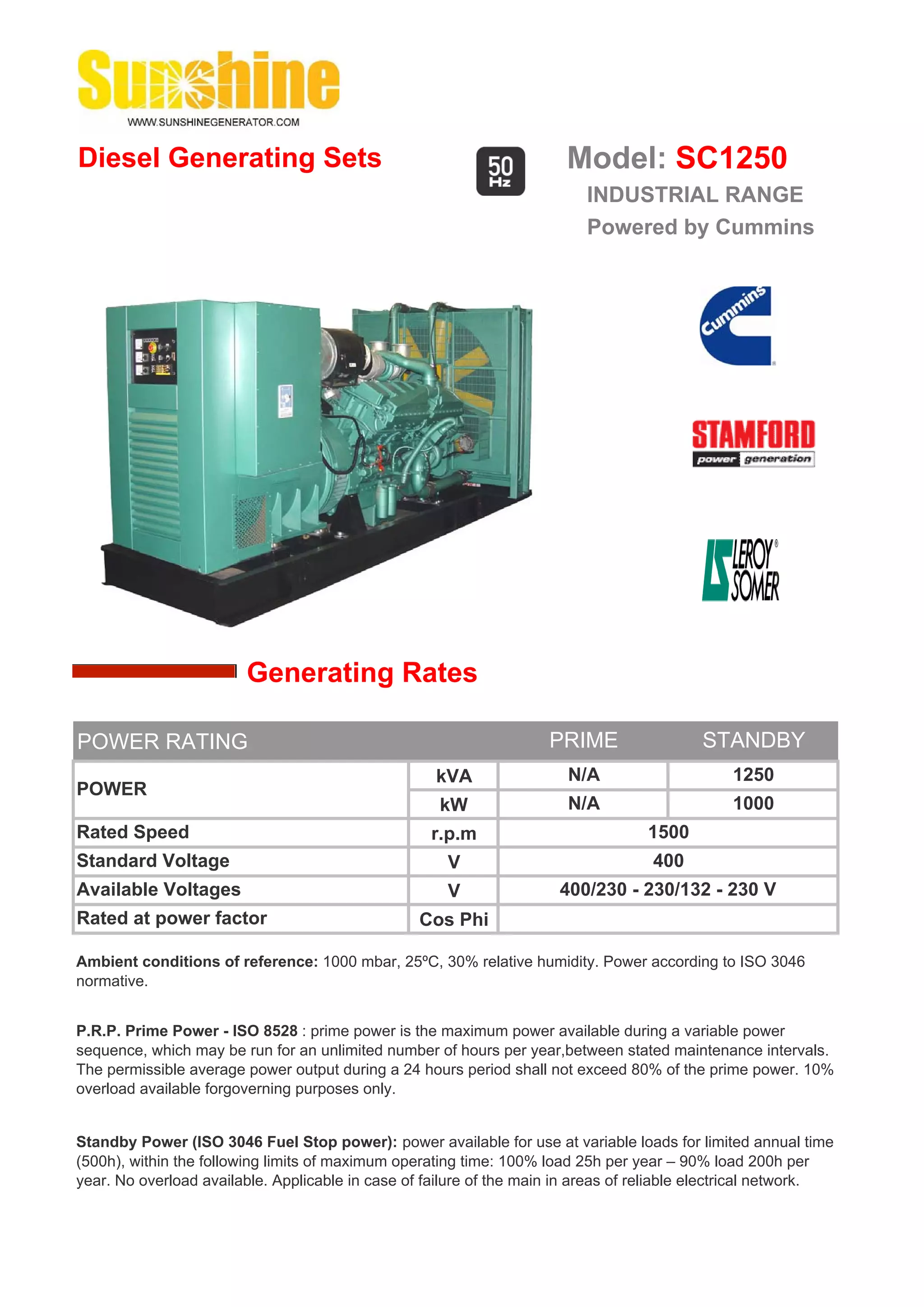 This document provides specifications for a diesel generator set model SC1250 powered by a Cummins engine. It has a standby power rating of 1250 kVA at 1000 kW. The generator set consists of a 4-cycle, 60 degree Vee, 12 cylinder Cummins KTA38-G9 diesel engine coupled to a Leroy Somer LSA50.2M6 or Stamford HCI634K alternator for prime and standby power applications up to 500 annual hours. Detailed specifications are provided for the engine, alternator, control panel, and standard and optional features.
