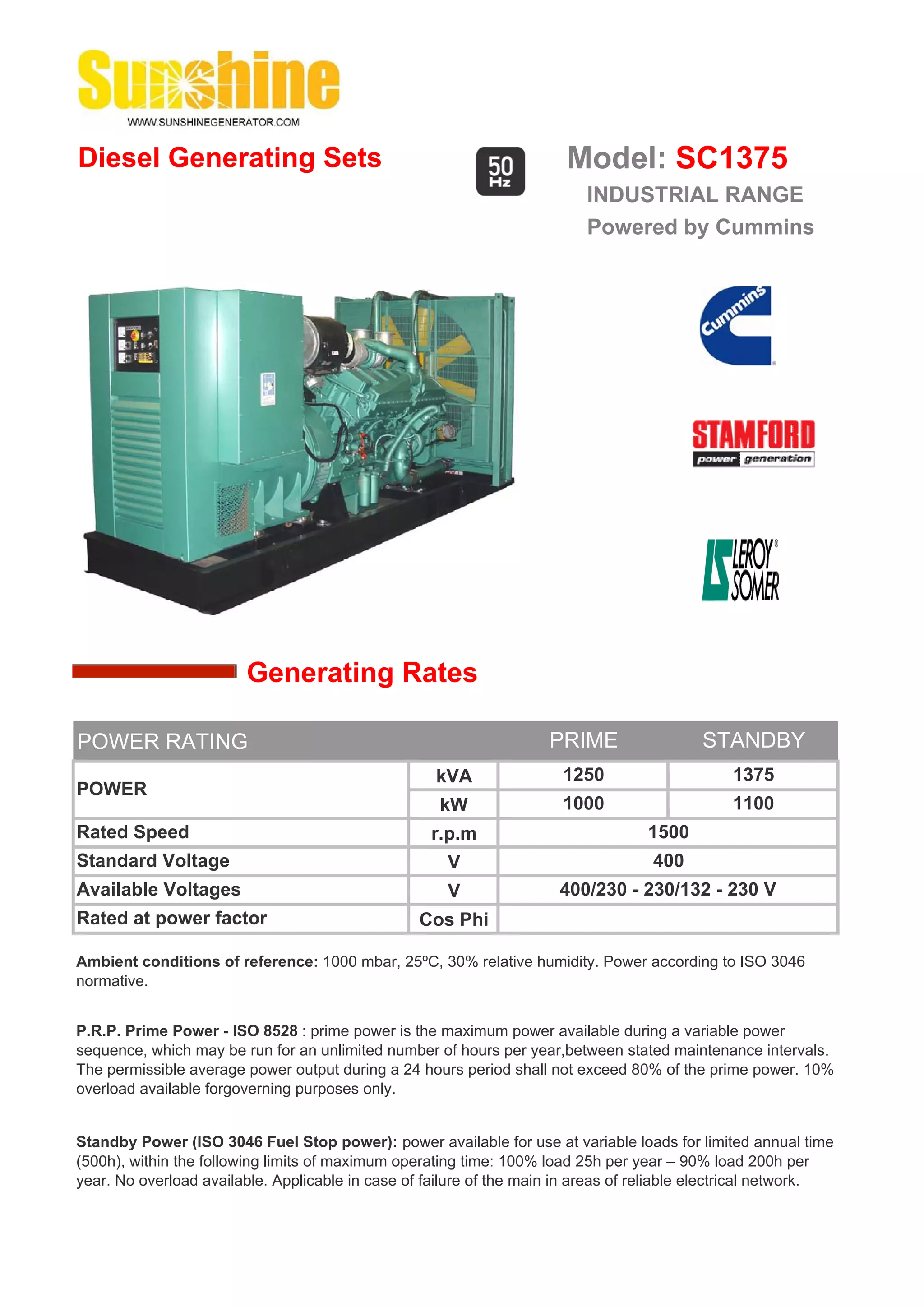 This document provides specifications for a diesel generating set model SC1375 in the industrial range powered by a Cummins engine. It is rated for 1250kVA prime power and 1375kVA standby power at 1500rpm. The set consists of a Cummins KTA50-G3 engine, Leroy Somer or Stamford alternator, base frame, control panel, and other accessories. Key specifications of the engine, alternator, control panel, and general features of the set are provided.