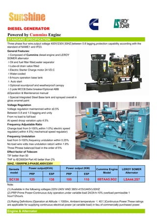 The document provides specifications for a diesel generator powered by a Cummins engine with a range of features, including a three-phase, four-wire output and protection capabilities. It emphasizes the generator's voltage regulation, cooling system, electrical systems, and options for soundproof and weatherproof canopies. The technical details include power output, fuel consumption, and compliance with various quality standards applicable to the generator's operation and design.