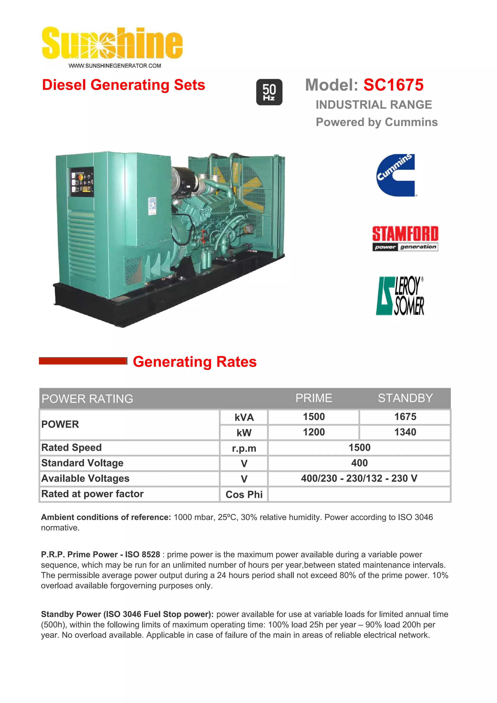 This document provides specifications for a diesel generating set model SC1675 powered by a Cummins engine. It can provide 1500 kVA of prime power or 1675 kVA of standby power. The set includes a 4-stroke, water-cooled Cummins KTA50-GS8 diesel engine rated at 1287 kW for prime power. An LSA50.2L8 or PI734C alternator provides 3-phase, 400V power. Additional details are given for the cooling, electrical, exhaust and control systems. Optional features include soundproofing, low fuel alarms, and an automatic transfer switch. Dimensions and weights are provided for open and soundproofed versions.
