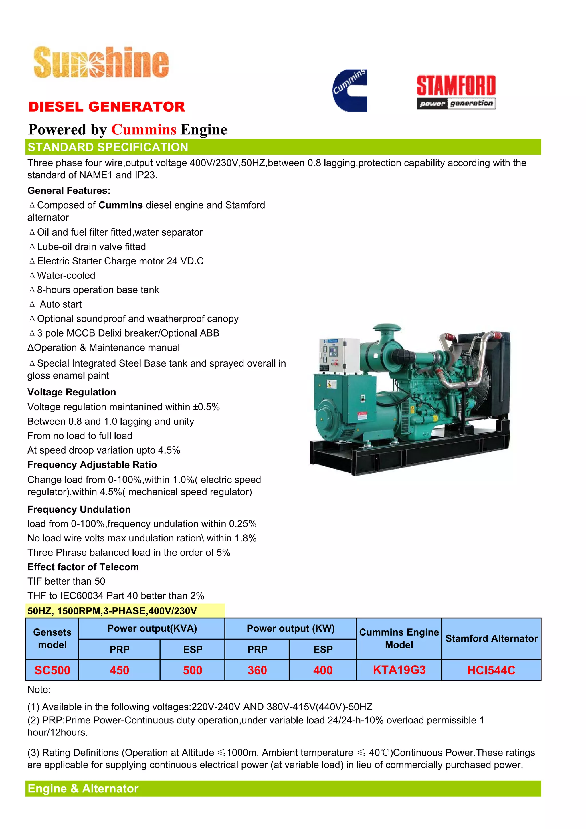 This document outlines the specifications and features of a three-phase diesel generator powered by a Cummins engine, providing an output voltage of 400V/230V at 50Hz. It includes details on the engine and alternator specifications, operational capabilities, cooling systems, and safety features, emphasizing compliance with various quality standards. The document also mentions optional features such as soundproof canopies and automatic control systems.