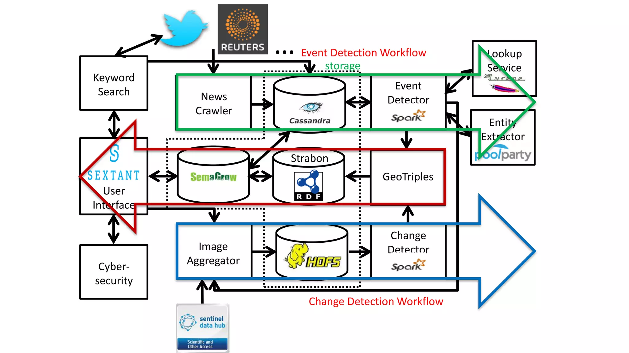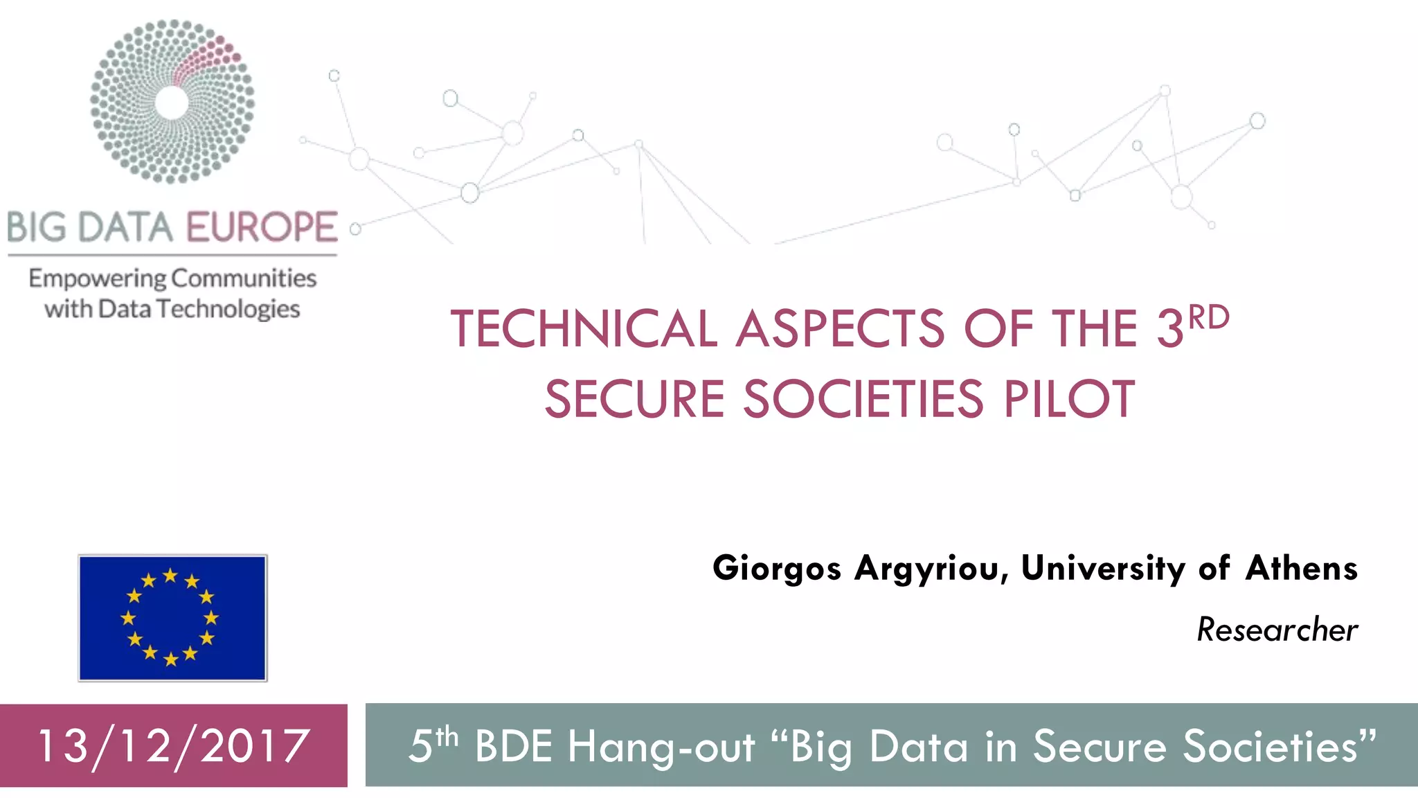 This document summarizes the technical aspects of the third Secure Societies pilot project. The pilot uses multiple data sources including satellite imagery, news articles, and Twitter posts. It has two main workflows: a change detection workflow that analyzes satellite images to detect changes over time using image processing techniques, and an event detection workflow that monitors social media and news to cluster events. Both workflows store results as linked geospatial data for visualization and querying through an interface. The change detector component parallelizes change detection algorithms on images using Spark.