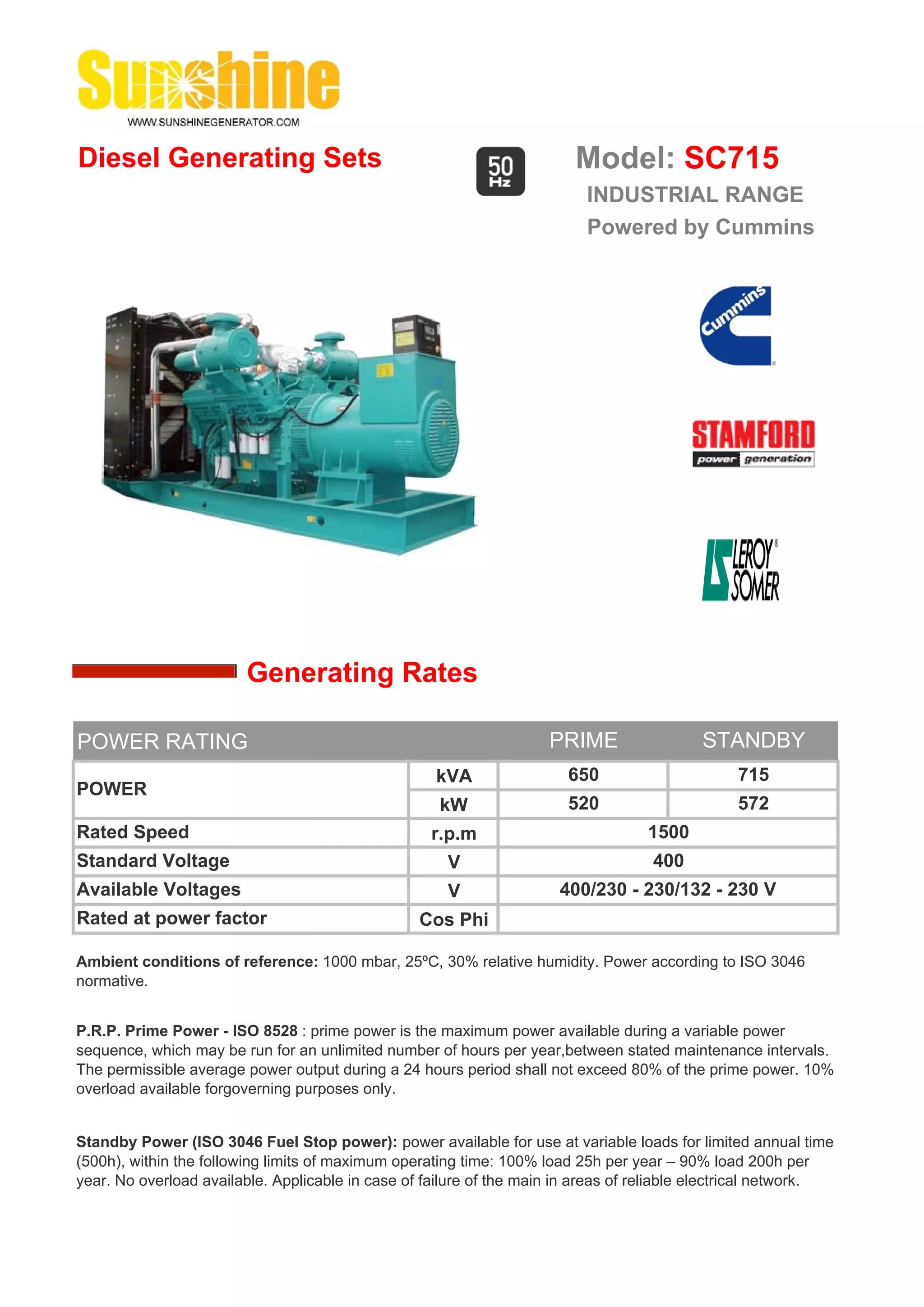 This document provides specifications for a diesel generating set model SC715 in the industrial range powered by a Cummins engine. The generating set has a prime power rating of 650kVA and standby power rating of 715kVA at 1500rpm. The engine is a Cummins KT38-G 12 cylinder diesel with a rated output of 560kW for prime power and 615kW for standby power. The document lists additional technical details including alternator specifications, control panel features, standard features, and specifications for a soundproofed version.