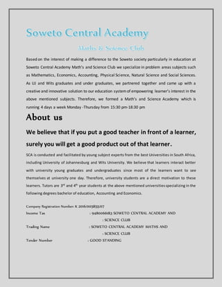 The document summarizes an after-school math and science club called Soweto Central Academy based in Soweto, South Africa. The club aims to help learners strengthen their skills in subjects like math, science, and economics through extra classes, tutorials, homework help and exam preparations. Run by young graduates and students from local universities, the club currently serves over 200 learners from various schools in the area four days a week. Its goals are to promote learning in an informal, pressure-free environment and cultivate students' interests in STEM fields.