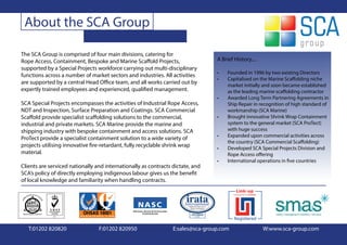 The SCA Group is a scaffolding and rope access company comprised of four divisions providing services across the UK and internationally. It was founded in 1996 and has since expanded to offer specialized services including marine scaffolding, containment solutions, commercial scaffolding, and rope access through divisions like SCA Marine, SCA Protect, SCA Commercial Scaffolding, and SCA Special Projects. The company is committed to building partnerships through high quality workmanship and safety.