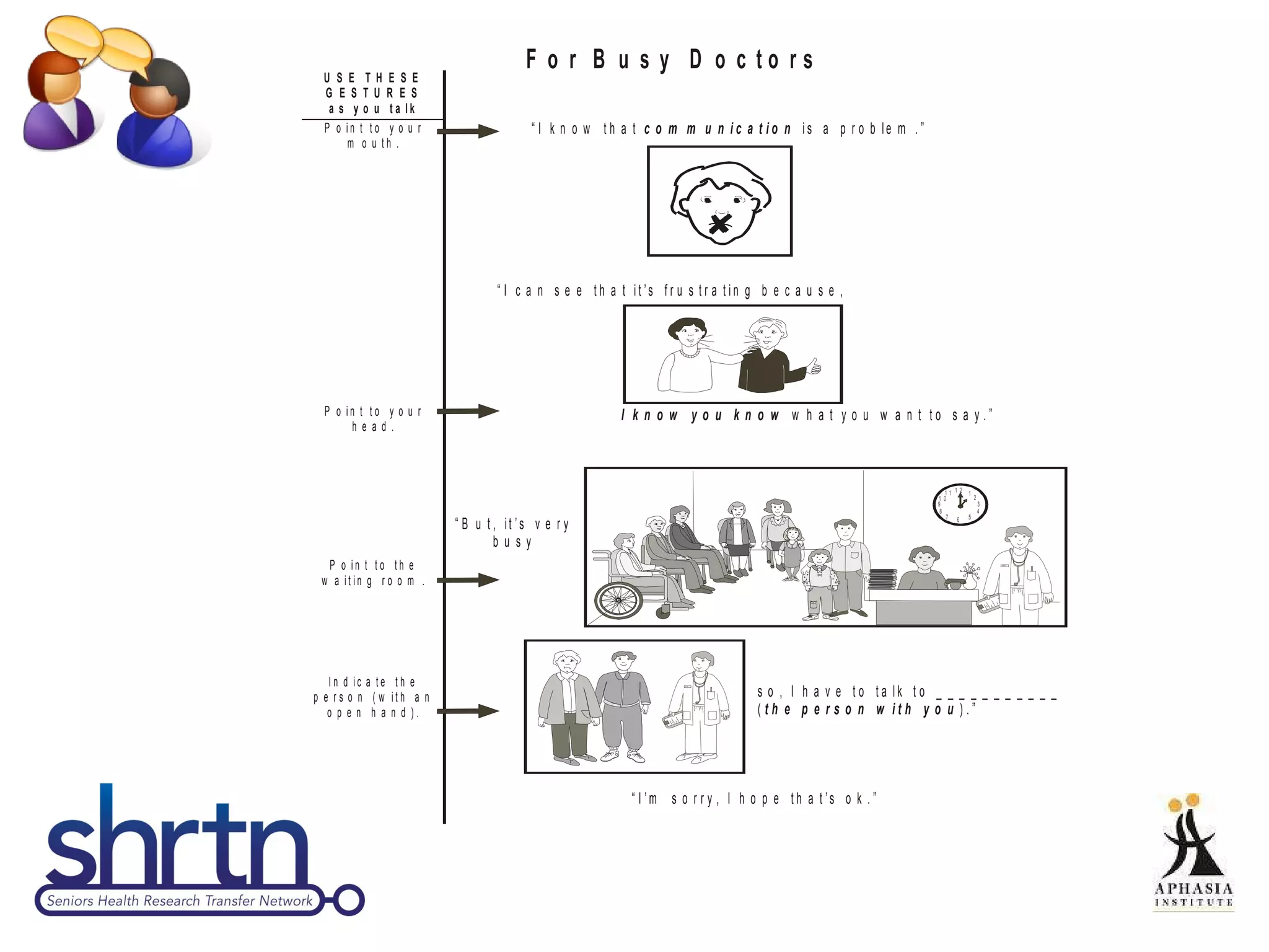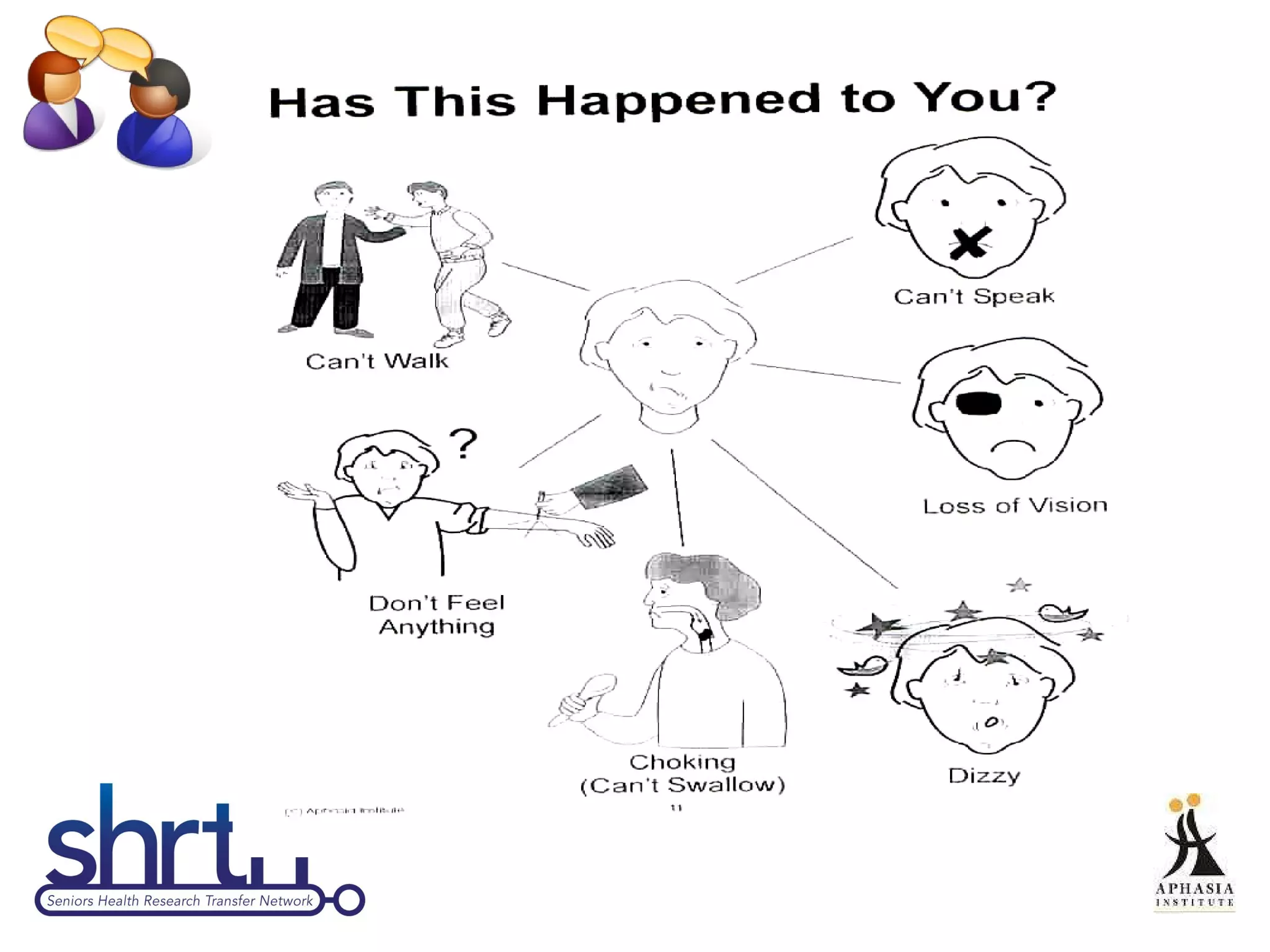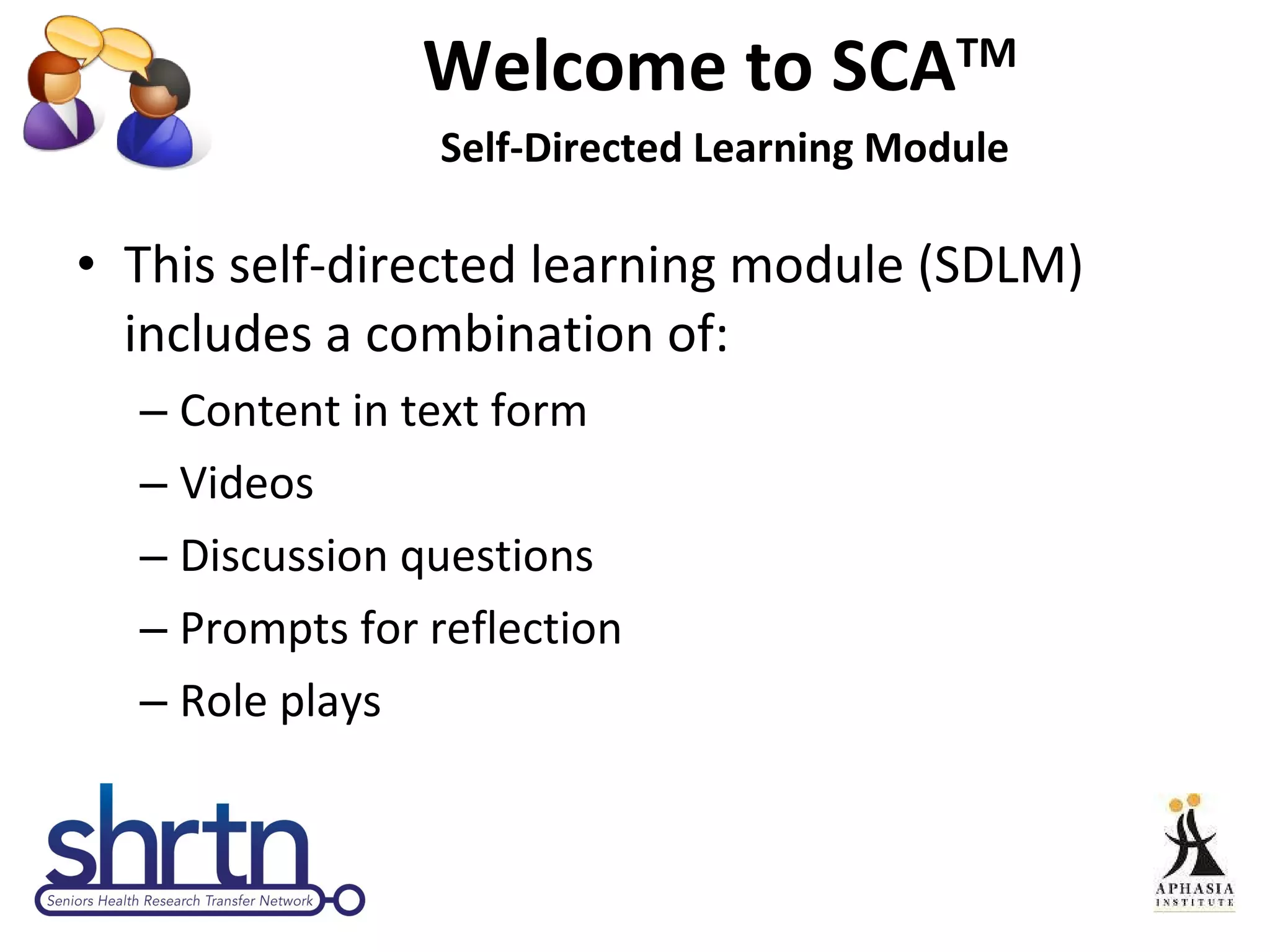 This document provides an introduction and overview of Supported Conversation for Adults with Aphasia (SCATM), a communication method that allows conversation with individuals who have difficulty expressing themselves or understanding verbal messages. It discusses what aphasia is, barriers people with aphasia face in healthcare settings, and how SCATM can be used to provide communicative access. The document includes videos, discussion questions, and prompts for interactive role plays to help users learn and practice using SCATM techniques.