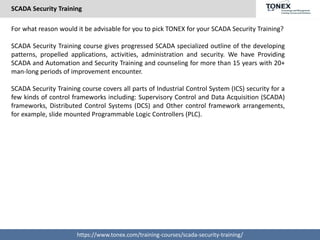 The document outlines a comprehensive SCADA security training course by Tonex, focusing on advanced technical aspects, vulnerabilities, and management of industrial control systems. It covers various SCADA technologies, security threats, and offers practical insights into securing SCADA environments. The course is suitable for personnel involved in SCADA operations, engineering, and security assessments, aiming to enhance their understanding of SCADA risks and solutions.