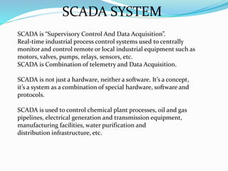 SCADA (Supervisory Control and Data Acquisition) systems are used to centrally monitor and control remote equipment and industrial processes. They allow for remote data collection, control of processes from a distance, creation of logs and reports, and sending of real-time information to engineers and operators. SCADA systems are used to control processes in industries like oil and gas, manufacturing, water treatment, and electricity. They consist of remote terminal units that collect field data, master control units that process information and send control signals, and communication networks connecting all components.