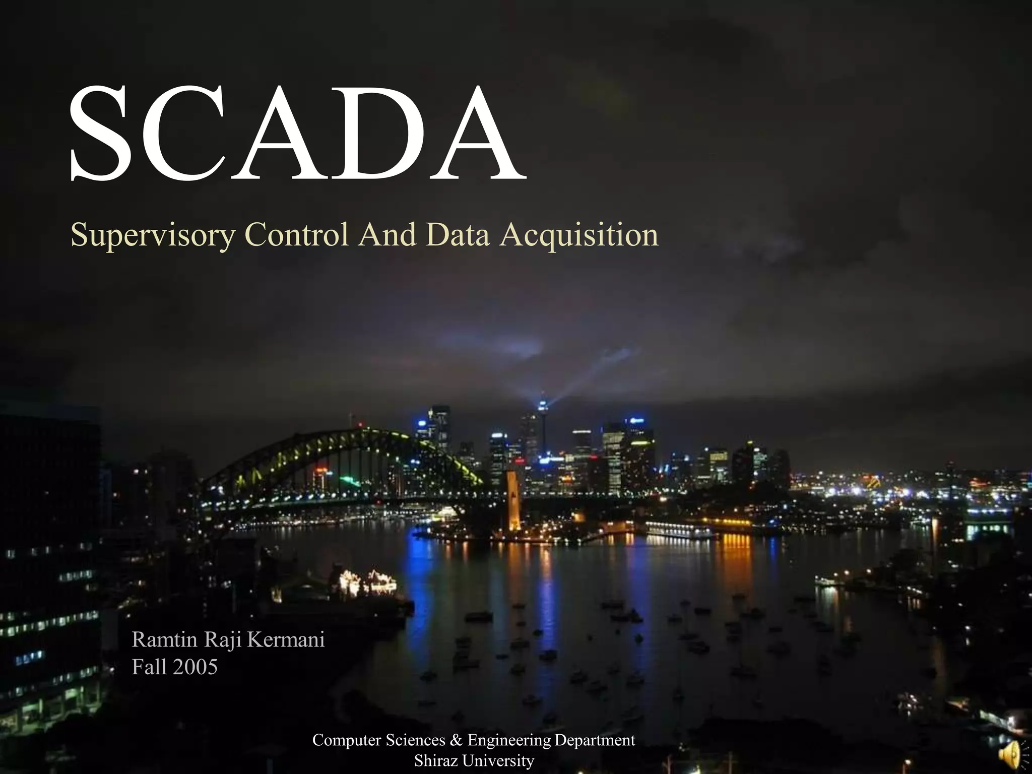 This document provides an overview of supervisory control and data acquisition (SCADA) systems. It defines SCADA as a combination of telemetry and data acquisition used to remotely monitor and control industrial equipment and processes. The document outlines the basic components of a SCADA system including field devices, remote terminal units, a master terminal unit, and communication networks. It also discusses where SCADA systems are used, common protocols, functionality, and new trends like web-based access and mobile phone monitoring. The goal of SCADA is to remotely collect data from various plants and facilities to monitor processes and equipment from a central location.