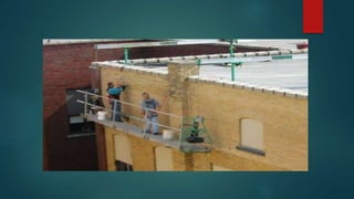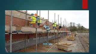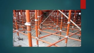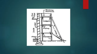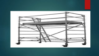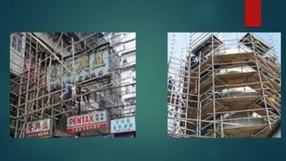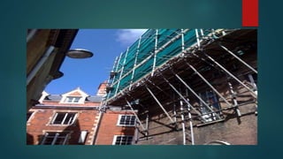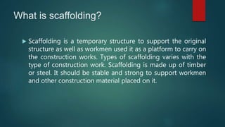 Scaffolding is a temporary structure used to support workers and materials during construction projects. There are several types of scaffolding that are used depending on the type of construction work. Single scaffolding consists of standards, ledgers, and putlogs used for brick masonry. Double scaffolding uses two parallel frames for stone masonry work. Cantilever scaffolding supports standards through holes in walls. Suspended scaffolding suspends working platforms from roofs. Trestle scaffolding supports platforms on movable tripods for indoor work. Steel scaffolding uses steel tubes and fittings for strength and flexibility. Patented scaffolding uses ready-made steel components with adjustable platforms.