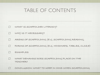 The document discusses scaffolding literacy. Scaffolding literacy involves providing resources to help students access and engage with classroom language and texts, and guides students toward independent language use. It is not focused solely on language. Scaffolding is necessary for teaching as it involves modeling practices, providing scaffolded activities, and guiding students from initiation into a practice to independent construction. Scaffolding can be used in areas like exploring words/concepts, organizing knowledge, supporting reading, guiding writing, and scaffolding listening.