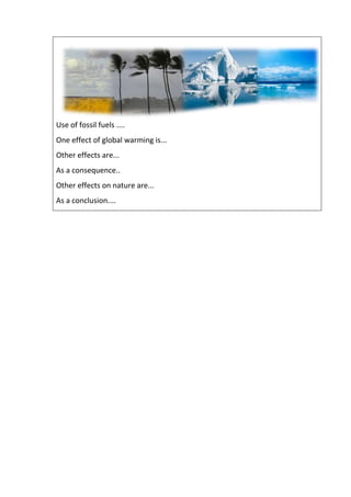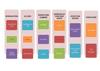 Global warming is caused by the use of fossil fuels which melts ice caps and causes droughts, famine, and rising ocean levels. This leads to more floods, tornadoes, and diseases. Effects on nature include flowers blooming earlier and birds being confused in their migration. The document calls for action and campaigning to address these issues.