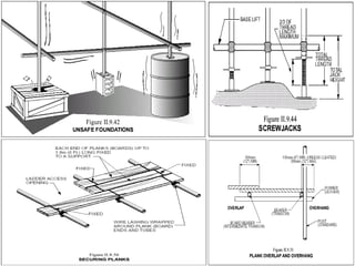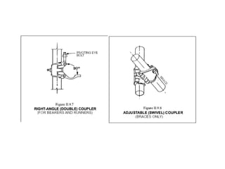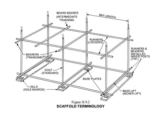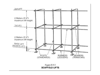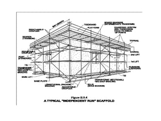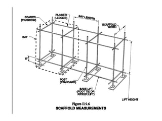 The document outlines safety definitions and regulations for scaffolding systems to ensure worker safety when working at heights. It includes specifications for scaffolds, fall protection measures, scaffold measurements, scafftag color coding, and construction guidelines for various scaffold types. Additionally, it presents do’s and don’ts for scaffolding practices to prevent accidents and ensure compliance with safety standards.