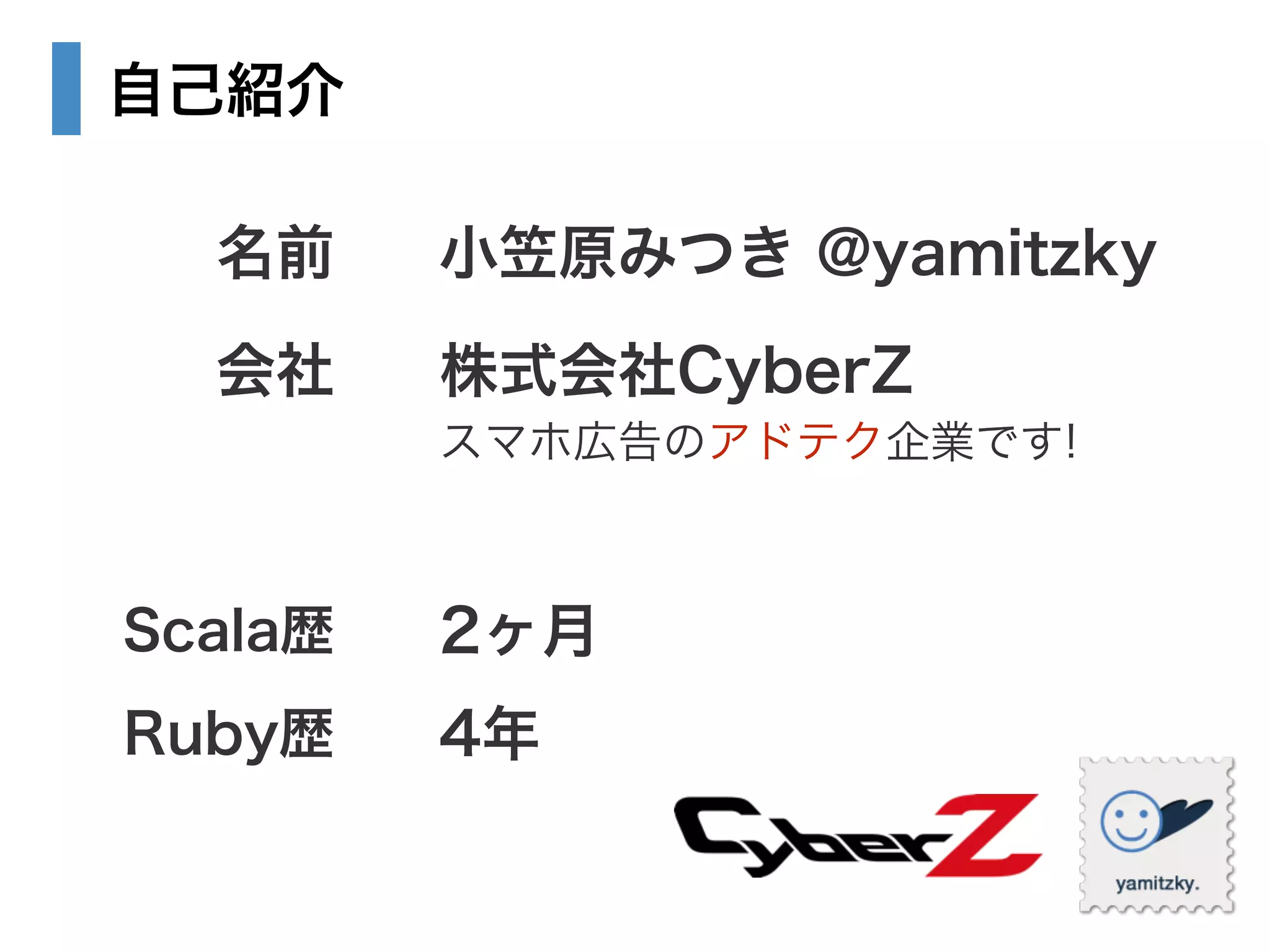会社株式会社CyberZ スマホ広告のアドテク企業です! Scala歴2ヶ月 Ruby歴4年