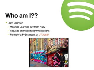 The document discusses the architecture and design of music recommendation systems at Spotify, emphasizing the use of machine learning techniques like collaborative filtering and matrix factorization. It details the data pipelines for processing user listening data and generating genre-specific artist toplists using tools such as Scalding and Apache Parquet. Additionally, the document covers various methodologies for efficiently handling and analyzing large datasets to improve music recommendations.