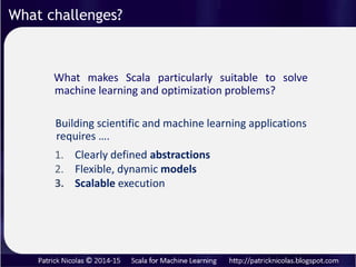 The document discusses the application of Scala in building scientific and machine learning applications, emphasizing its abstractions, flexibility, scalability, and ability to model dynamic workflows. It presents Scala's features such as functorial tensors, kernel monadic composition, and actor-based deployments as solutions to challenges faced in machine learning. Through examples and theoretical frameworks, it highlights how Scala can effectively handle complex algorithms and large datasets while maintaining a strict mathematical formalism.